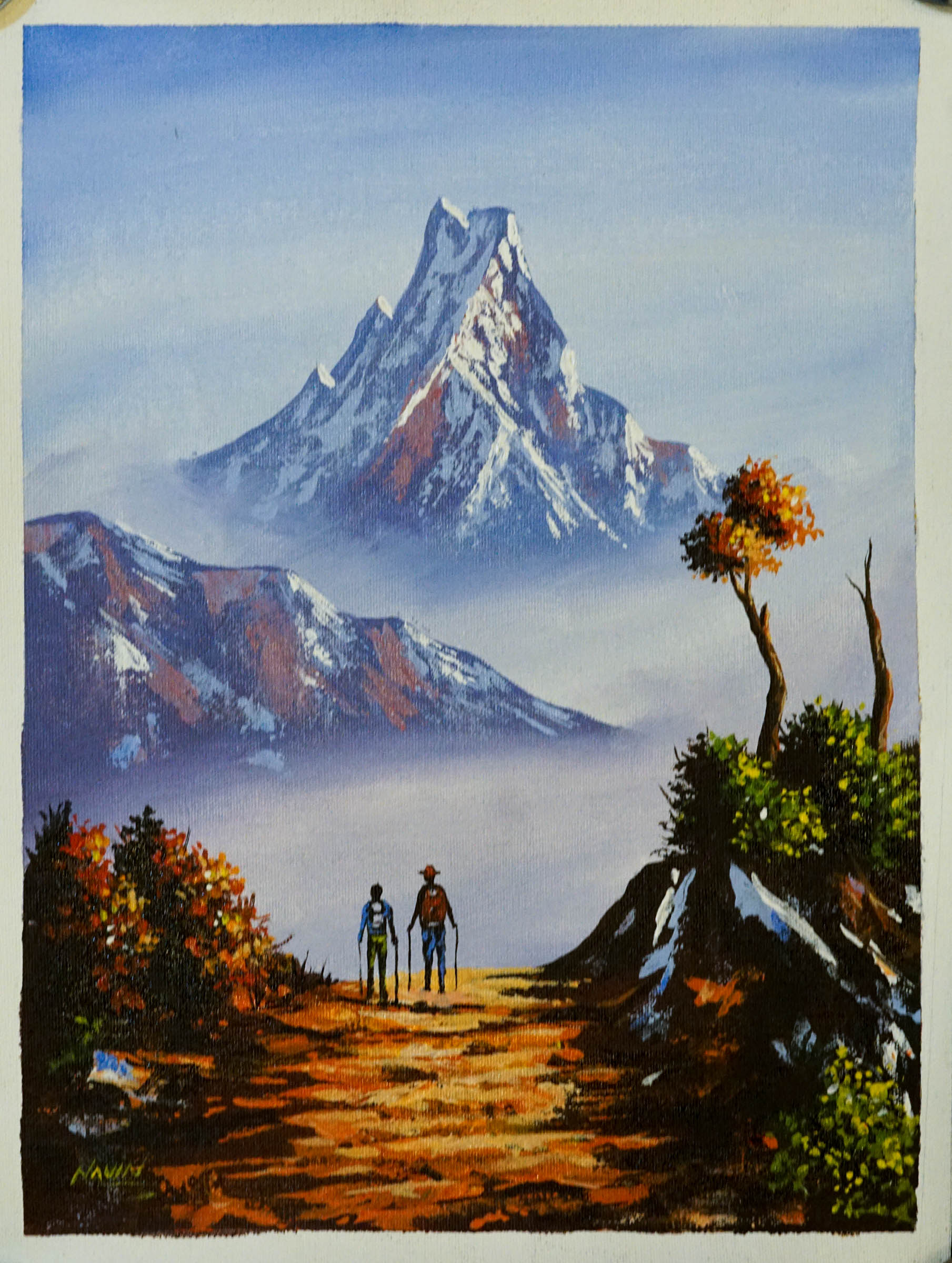 Handmade painting of Mt. Fishtail with Trekkers on Canvas