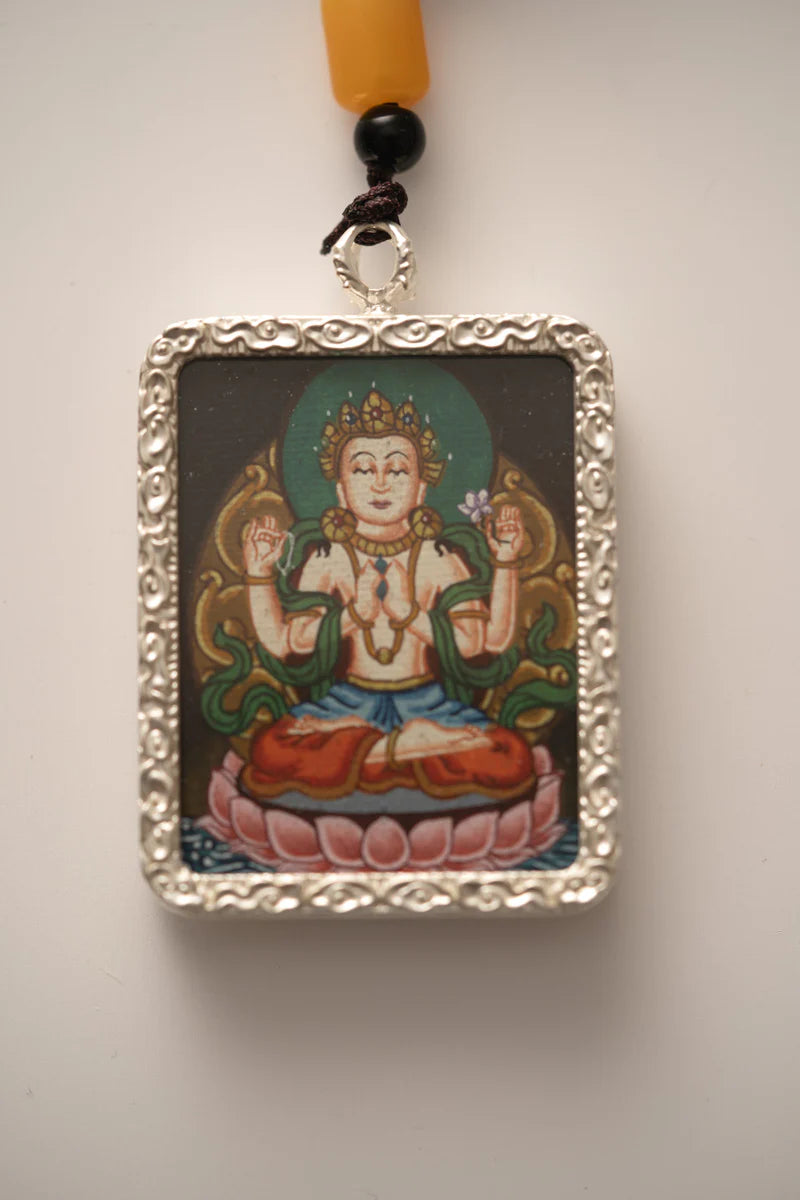 This Chenrezig Ghau Thangka Locket depicts Chenrezig (Avalokiteshvara), the bodhisattva of compassion revered in Tibetan Buddhism. Known as the embodiment of infinite compassion, Chenrezig inspires boundless love, mercy, and the wish to alleviate suffering. The front of the locket features his serene and compassionate image, while sacred artwork on the back enhances its spiritual depth.