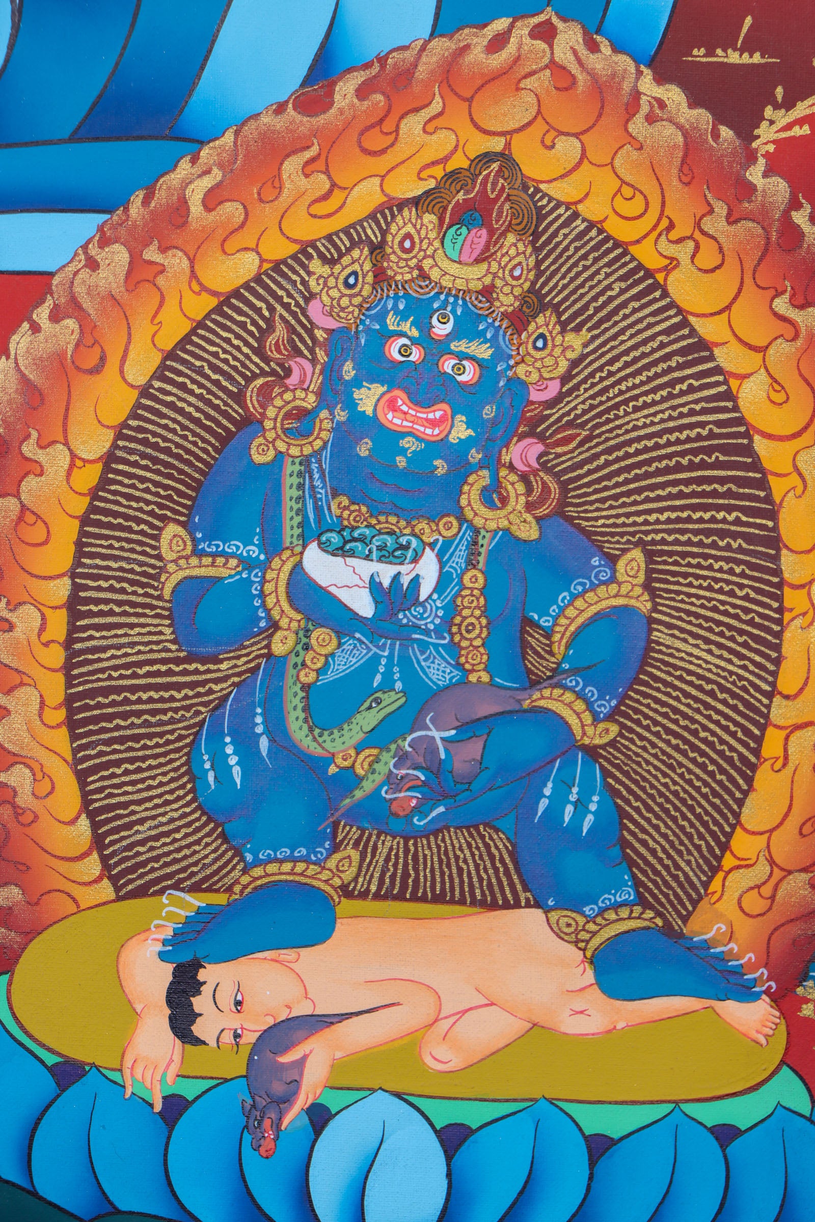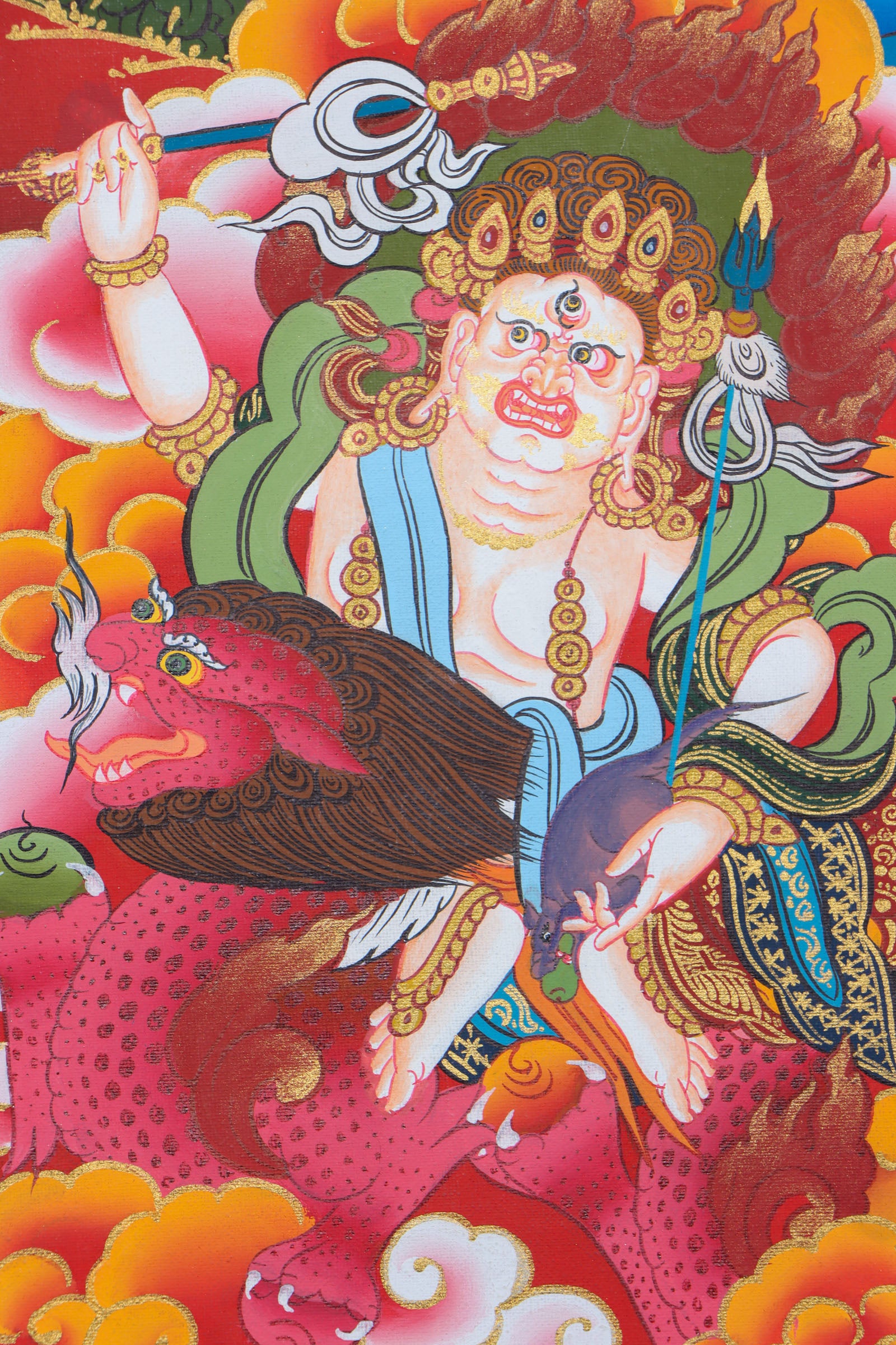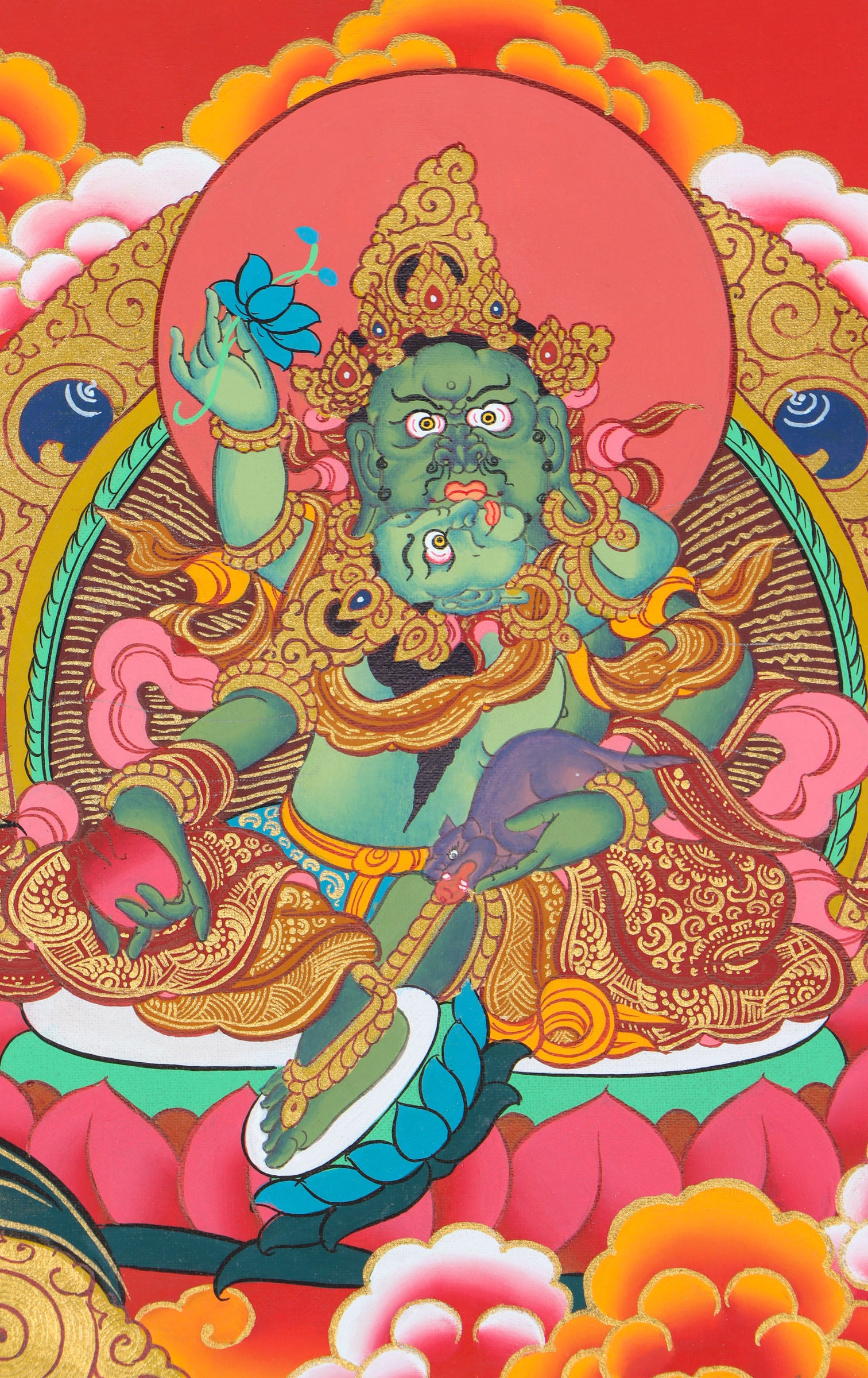 A Pancha Zambala thangka is a type of traditional Tibetan Buddhist painting that depicts the Five Wealthy and Protective Deities known as the Pancha Zambala. These deities are associated with wealth, abundance, and protection. Each deity is depicted with their own unique attributes and mudras (hand gestures). They are often surrounded by various symbols and auspicious elements associated with wealth, such as jewels, treasures, and auspicious animals.
