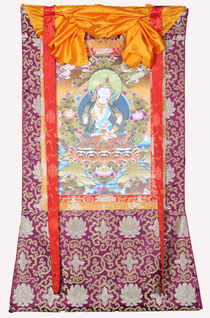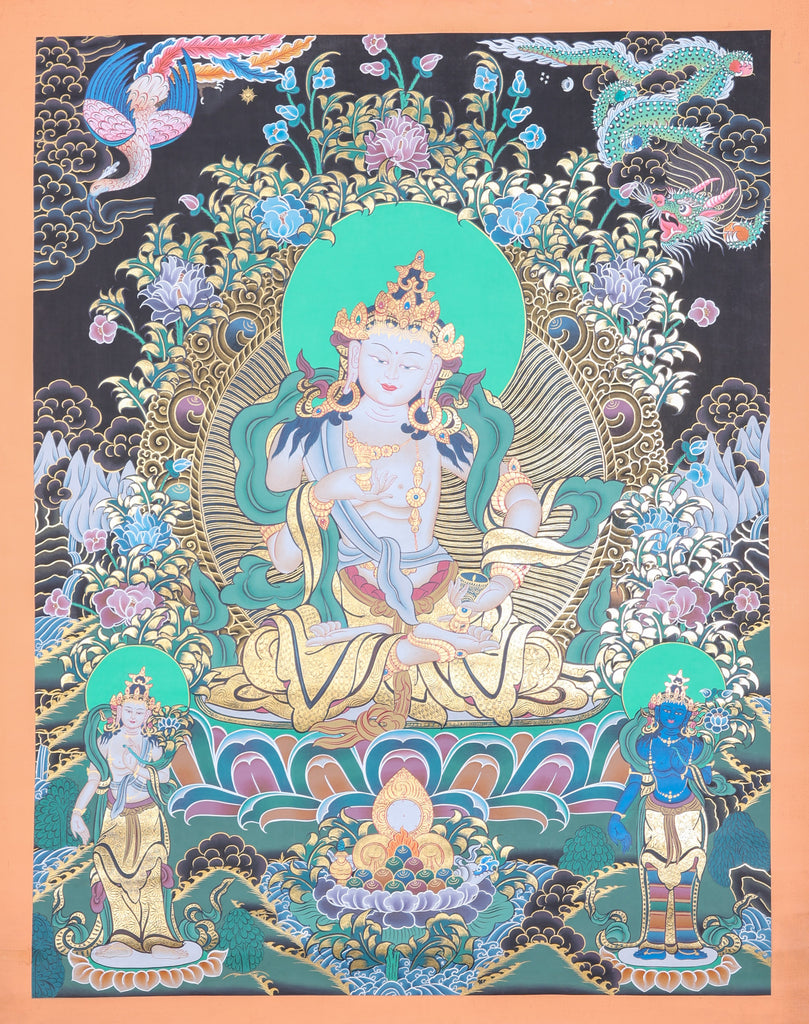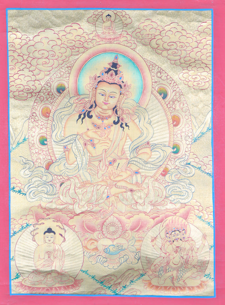 Vajrasattva is one of the supreme deity in Buddhism, most importantly in Vajrayana Buddhism and is venerated to eliminate spiritual impurities or purification. He is represented in two forms, single and yabyum. He is usually white in color and sits crossed legged holding a bajra in his right hand with palm upward against his chest and a bell in his left resting on his lap