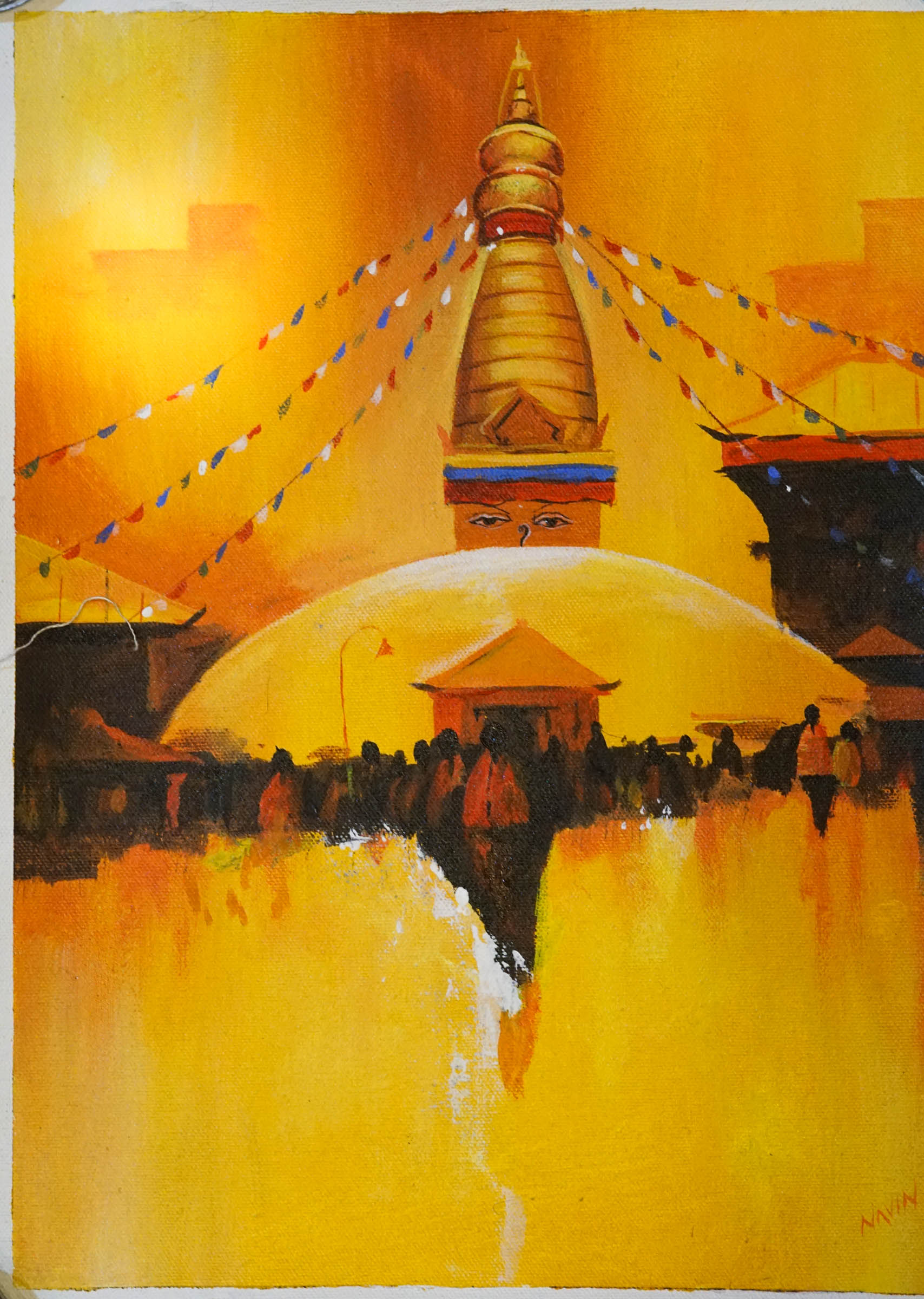 This is Nepali original hand painted oil painting of Swayambhunath which is painted by skillful artist. This exquisite landscape painting is 38-inch x 40-inch size and was created using acrylic on un-stretched canvas. The bold brushstrokes in this visceral and expressive painting keep the viewer's gaze roving around the composition and absorbing the full drama of color and line. Swayambhunath stupa is beautifully depicted in the oil painting by our skillful artisan which provides very religious and spiritual vibe if you put this painting in your home or office. Swayambhunath Stupa is the oldest and perplexing of all the heavenly hallowed places in Kathmandu valley. Its grandiose white arch and sparkling brilliant tower are obvious for some miles and from all sides of the valley.
