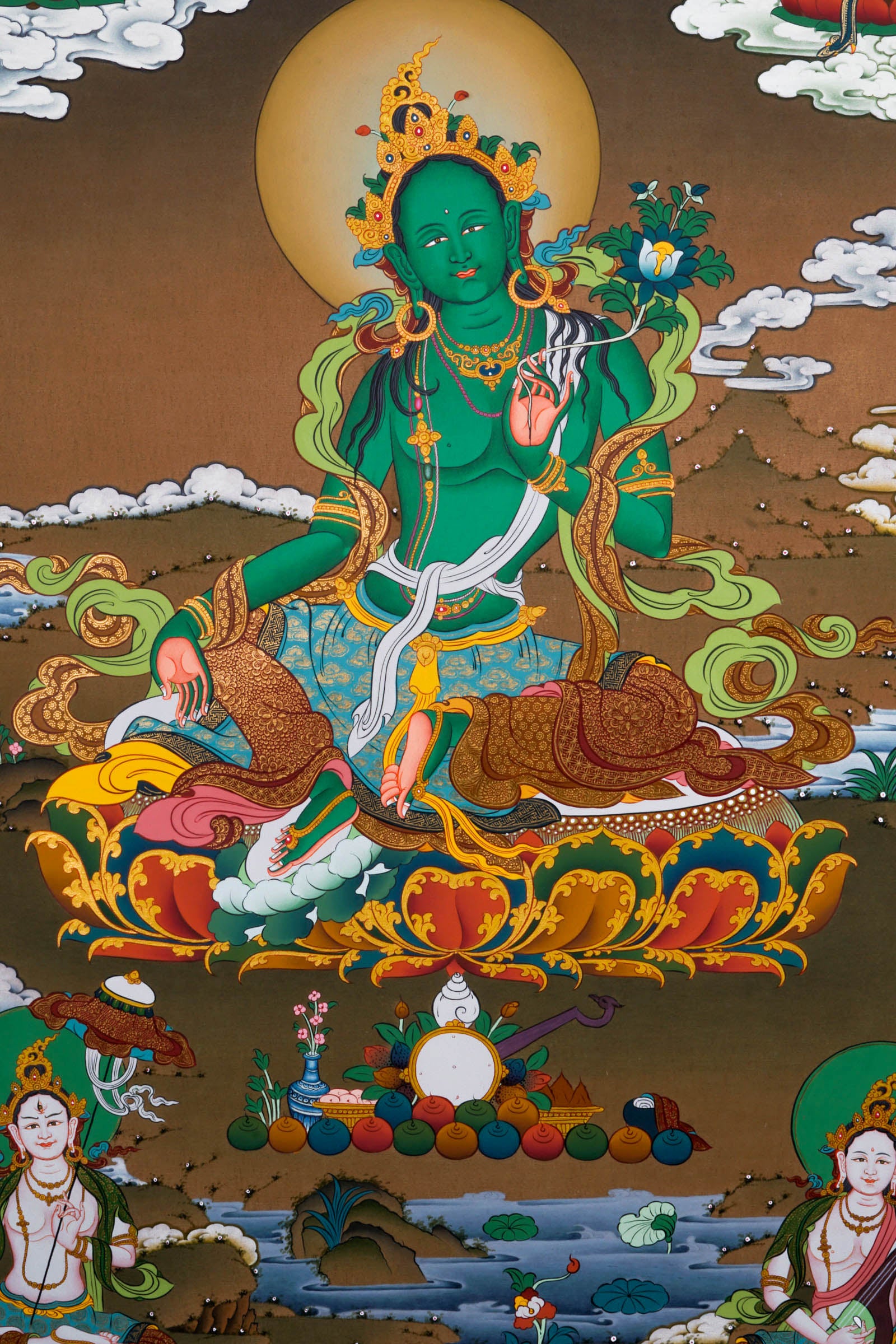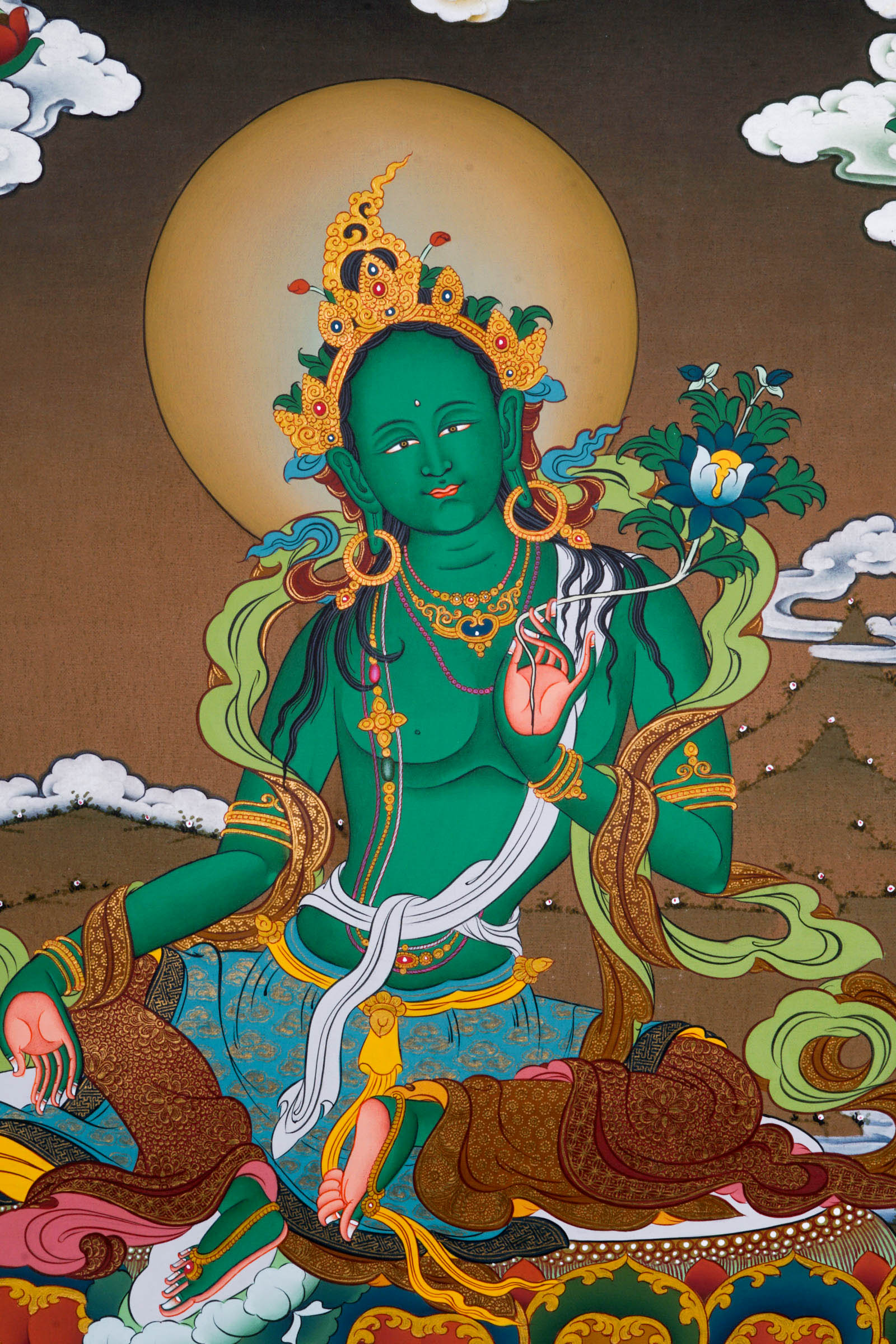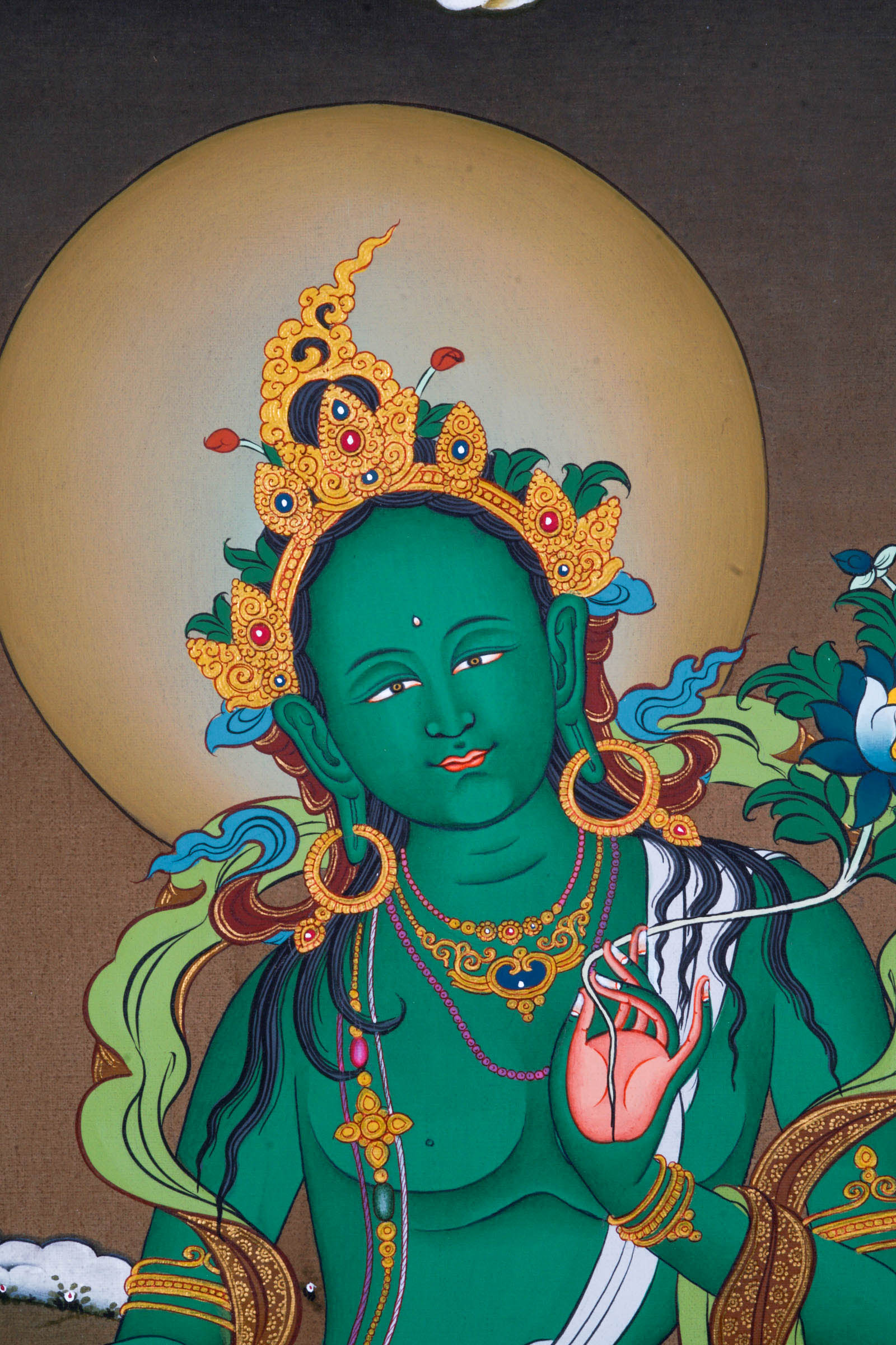 Green Tara is believed to be born from the compassionate tear of Avalokiteshvara when he was looking down the world of suffering. The suffering let his tear fall down and from left a white peaceful Tara was born and from right fierce green. Her posture is portrayed with right leg extended with ease, signifying she is always ready to help being from suffering and left leg folded in contemplative position on lotus pedestal symbolizing the integration of wisdom and art. She holds a blue lotus on her left hand symbolizing purity and power while right hand makes boon granting gesture.