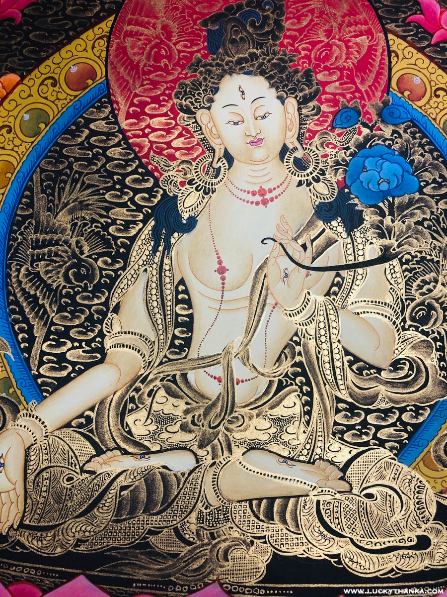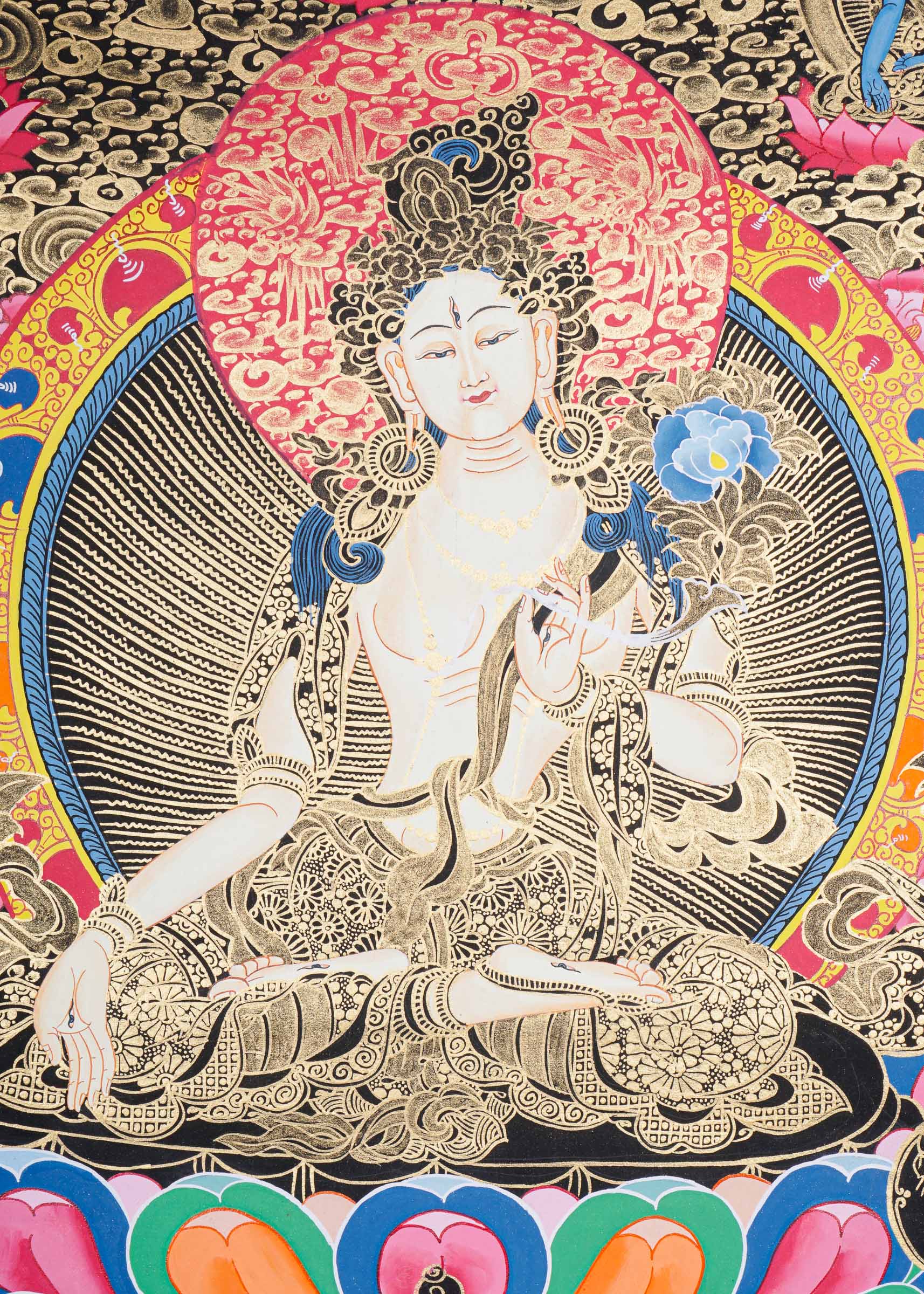 A White Tara Thangka is a traditional Tibetan Buddhist painting that depicts White Tara, a beloved deity associated with compassion, longevity, and healing. White Tara is a female bodhisattva who embodies the enlightened activity of long life and serenity. Thangkas of White Tara are intricately crafted using mineral and vegetable pigments on cotton or silk, showcasing vibrant colors and detailed iconography that convey her serene and compassionate nature.