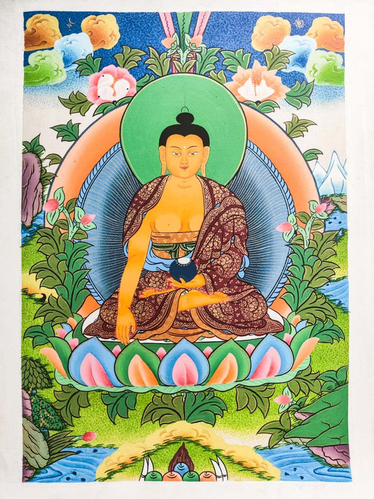 Buddhist Thangka painting depicting Shakyamuni Buddha is perfect for various home decor ideas! All our Thangka paintings and Tibetan mandala. This 100% hand-drawn Thangka painting in Kathmandu Valley, Nepal. Thangka painting can be decorated as an elegant and eccentric wall hanging in your home or office being a centerpiece of attention. It can also be placed on your family altar for meditation purposes as well as spiritual and emotional healing, attracting benevolent energy of the Tibetan Buddhist art. This is one of our best collection high quality Buddha Thangka art.