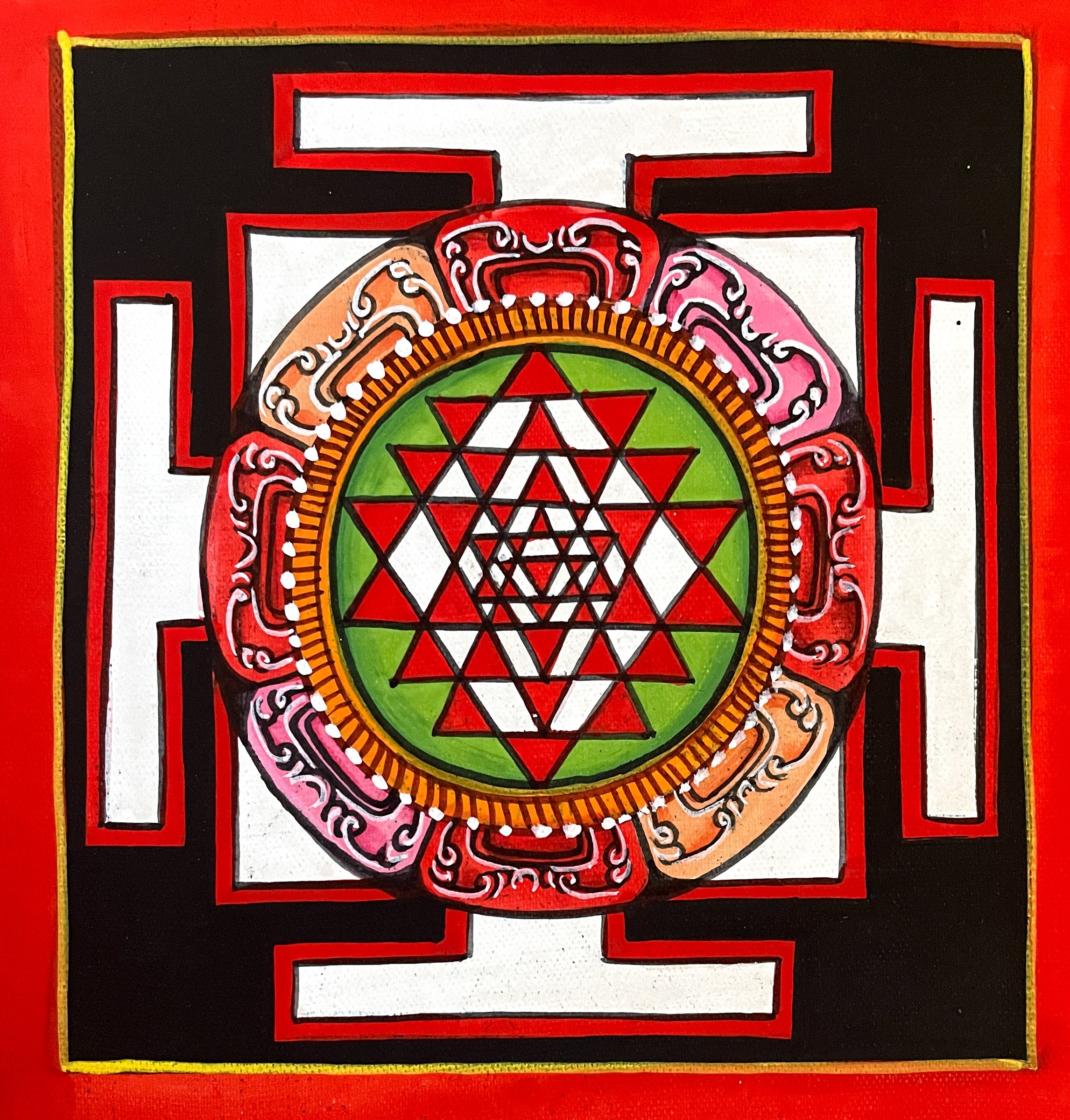 The Shri Yantra, called the “queen of yantras,” (rajayantra) is the symbol of the great divine mother principle, the source of all energy, power, and creativity. Vedic traditions, specifically the Shri Vidya school of tantra, regard the design as the representation of the universe as well as the body of the goddess related to the feminine principle of shakti or energy. Every line, triangle, and lotus petal symbolizes a specific type of shakti.